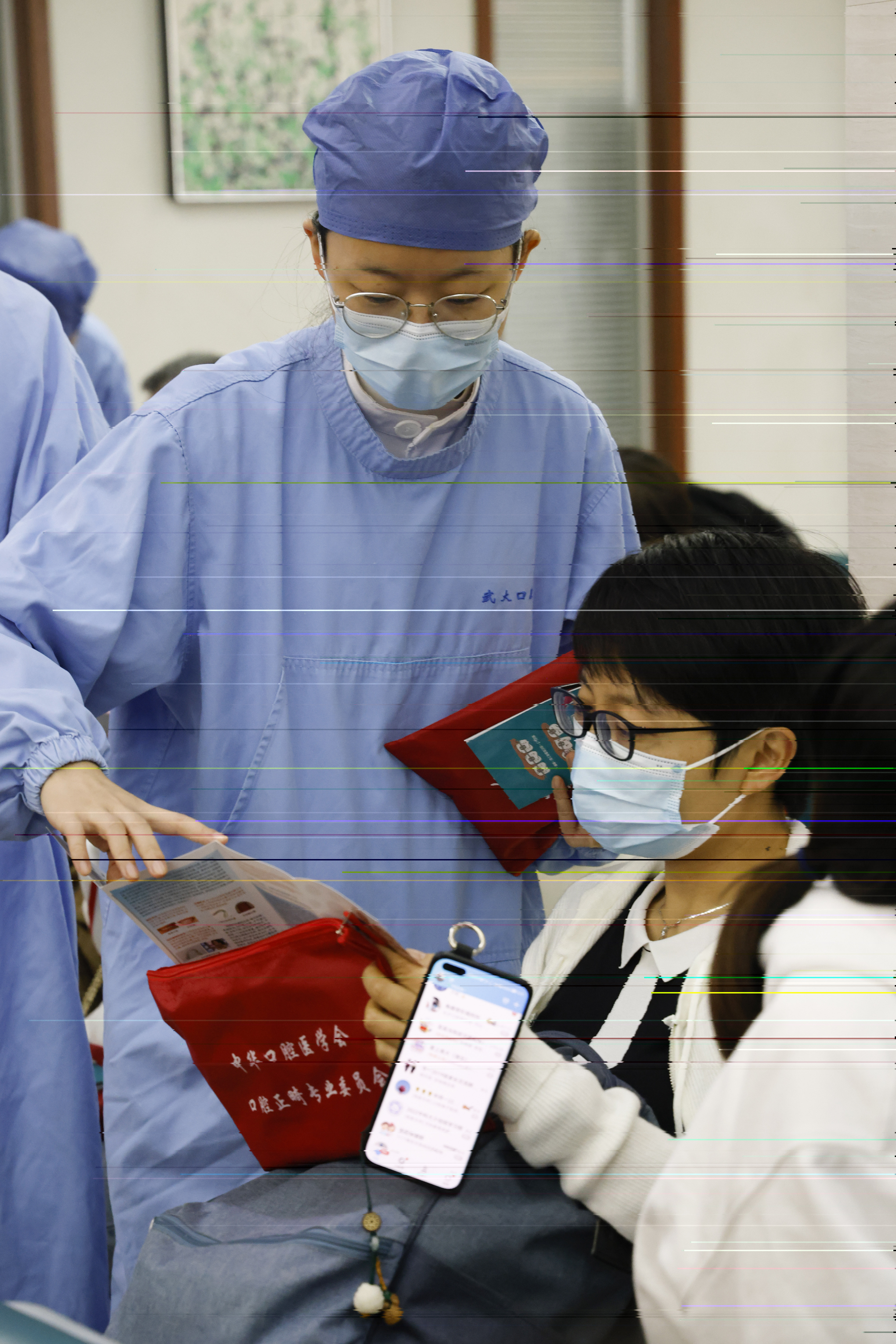 活動當天,賀紅主任帶領科室醫護及研究生在二号樓一樓大廳及正畸一科候診大廳對來院的部分新診患者和正畸複診患者進行了口腔檢查,健康宣教,發放了正畸護理禮包。