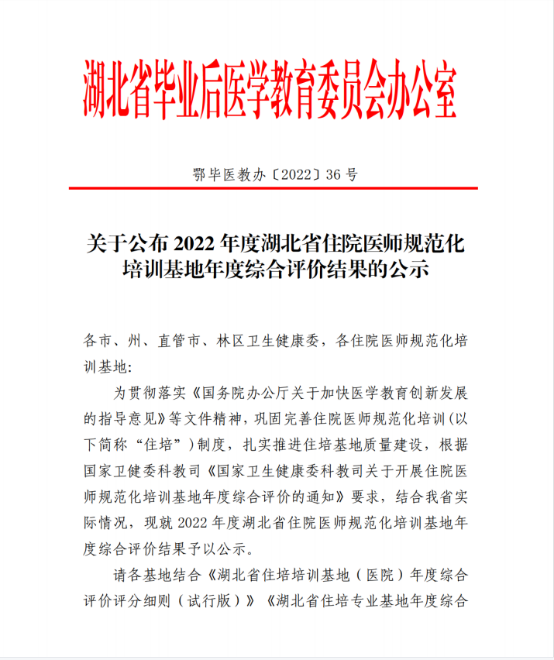 我院在2022年湖北省住培基地年度綜合評價中排名全省第一名
