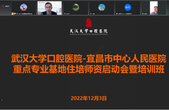 2022年12月3日,我院與宜昌市中心人民醫院口腔全科基地在線上召開了重點專業基地聯合培養住培師資培訓啟動會暨培訓班,8858ccl8利官网程勇副院長、口腔全科基地周修能主任及教學小組成員,宜昌市中心人民住培辦陳平主任、口腔全科基地奂忠平主任及教學小組成員參與了授課,兩院共計100餘名口腔全科住培師資參加培訓,會議由武大口腔畢教辦張弢副主任主持。