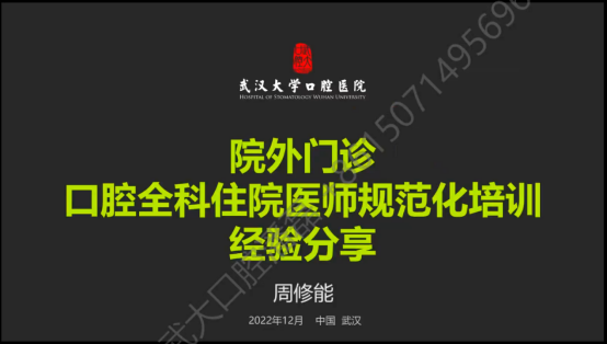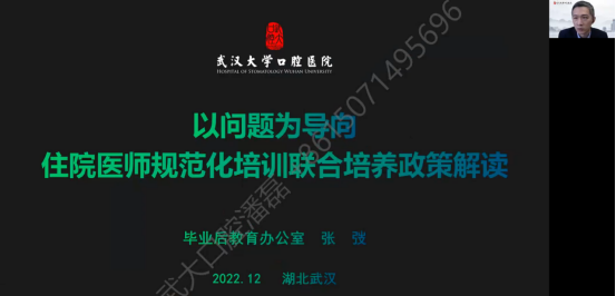 武大口腔畢教辦張弢副主任以問題為導向,詳細介紹湖北省畢業後醫學教育培訓基地聯合培訓試點工作的詳細方案及住培師資管理細則。最後由兩家基地的住培骨幹師資肖微和王佳俐老師分享了口腔全科相關的病例并研讨。