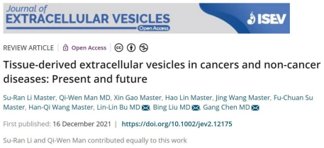 我院口腔颌面-頭頸腫瘤外科劉冰教授、蔔琳琳副教授及陳剛教授團隊的論文Tissue-derived extracellular vesicles in cancers and non-cancer diseases: Present and future發表于國際著名雜志JOURNAL OF EXTRACELLULAR VESICLES(IF:25.8,國際細胞外囊泡協會會刊)。該綜述系統讨論了Ti-EVs在癌症和非癌症疾病中的最新進展,對各種病變來源Ti-EV分離和表征的工作流程進行了回顧和比較,随後提出了Ti-EVs在基礎研究和臨床實踐中的應用前景,此外,文章讨論了目前Ti-EVs研究領域存在的挑戰,并提供了潛在的解決方案及發展方向。8858ccl8利官网腫瘤外科蔔琳琳副教授、劉冰教授和陳剛教授為論文的共同通訊作者,碩士研究生李素冉及腫瘤外科青年醫師滿其文博士為論文共同第一作者。文章在發表後立即受到了全球學者們的廣泛關注,在發表後的12個月内即獲得了 4081 次下載,位居該期刊中國作者2022年度下載量前十。