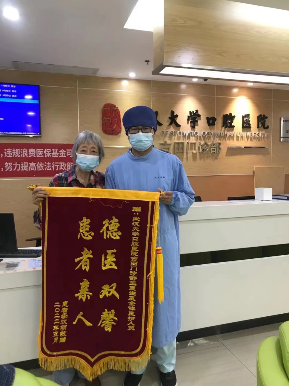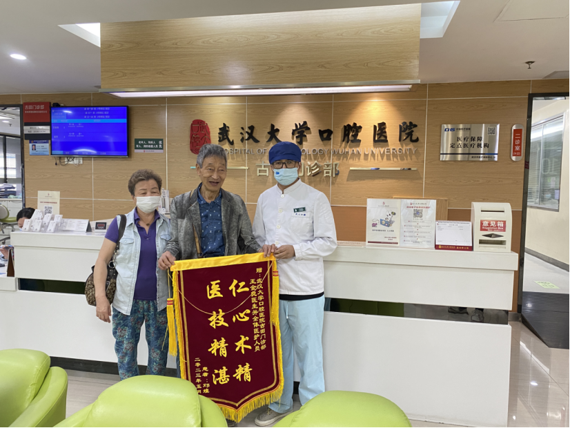 2023年4月,在患牙牙周炎症基本控制情況下,鄧老先生選擇了拔除患牙,後行上半口義齒修複。鄧老先生表示拔牙術後反應良好,重新修複後已恢複良好的咀嚼功能且無明顯不适。康複後,鄧老攜老伴兒向積極為他解除病痛的“忘年交”(王金良)送來了錦旗。