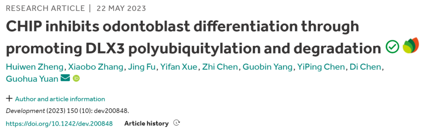 近日,我院袁國華教授課題組在發育學權威期刊Development雜志上發表題為“CHIP inhibits odontoblast differentiation through promoting DLX3 polyubiquitylation and degradation”的研究性論文成果。Development雜志是一個涵蓋發育生物學領域的領先研究的期刊,是發育生物學的經典老牌雜志,緻力于發表跨越動物和植物發育生物學領域的前沿研究,反映生物-發育生物學領域的新進展、新技術、新成果,促進發育學領域的科研交流和科研成果轉化。